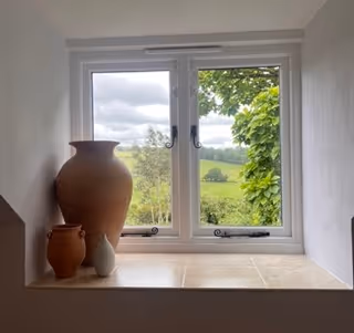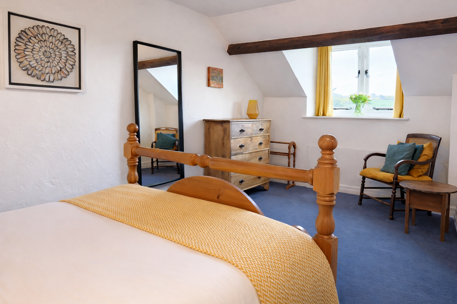 The middle bedroom upstairs is stunning and has some of the most beautiful views over the garden and local countryside. The double bedroom, which some great character features such as wood floors, has an iron frame super-king size bed, as well as a wardrobe and a dresser.