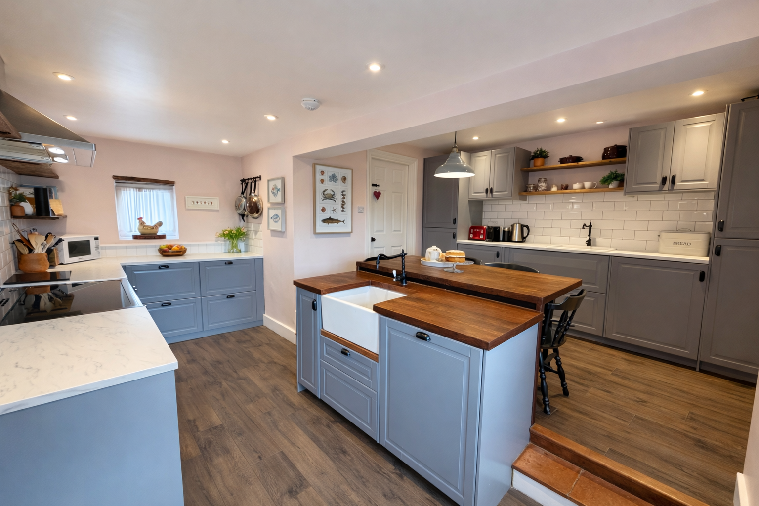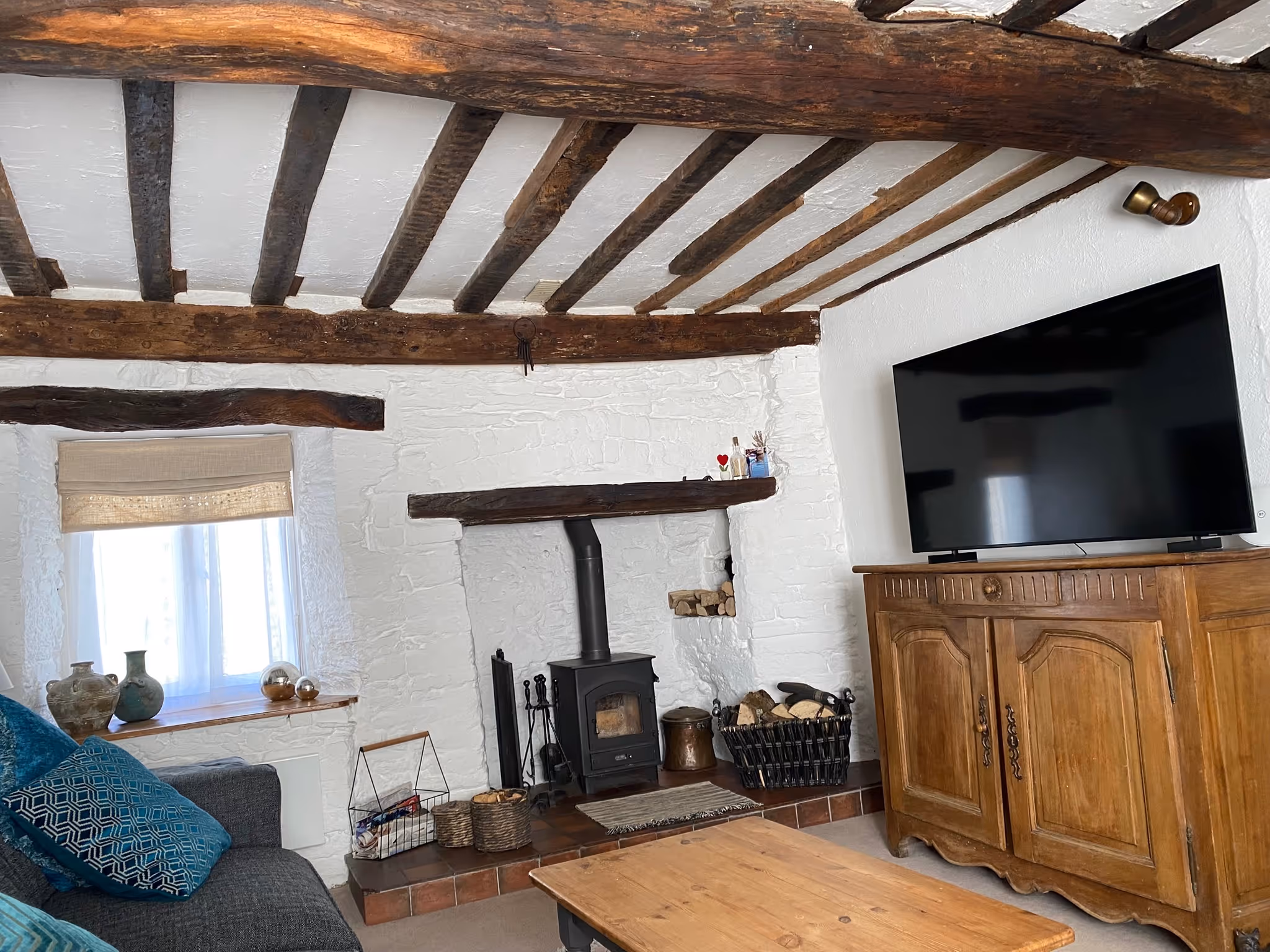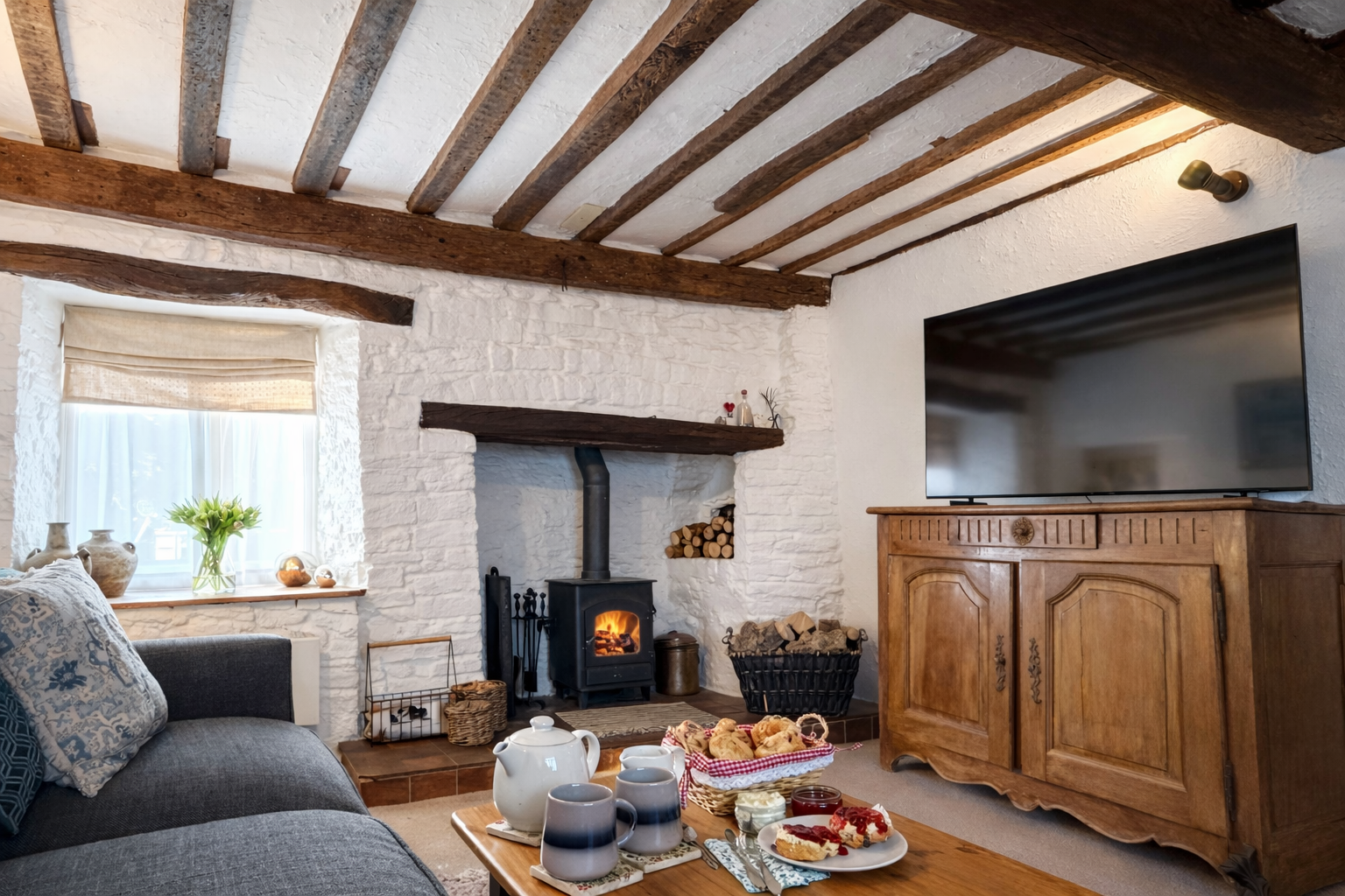 The dual aspect living room is packed full of character thanks to its wood beamed ceiling and the wonderful wood burner, which is great for those cosy winter months. Within the comfy living room is a large L-shaped sofa, a Smart TV and a good selection of books and games.
