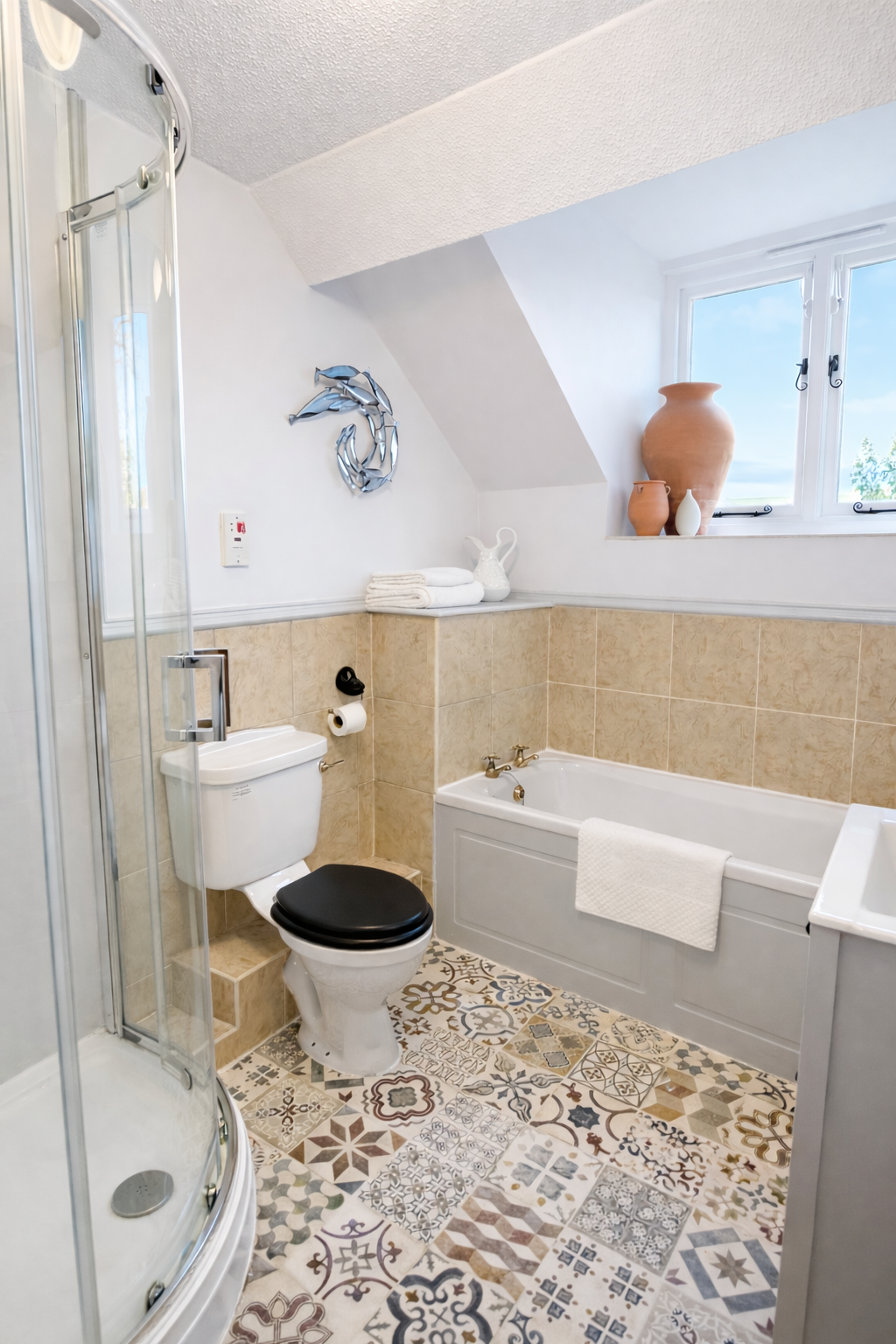 The large first floor family bathroom has a bath, a separate shower, a loo and a wash basin. There is also a nice big window with countryside views and a handy heated towel rail.
