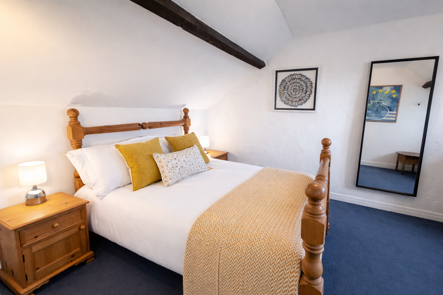 If you turn right at the top of the stairs at the far end of the first floor hallway is a good sized double bedroom with a traditional pine double bed. This tastefully decorated bedroom has countryside views and storage is provided in the form of a chest of drawers and wall mounted hooks. This room is conveniently next door to the main bathroom.