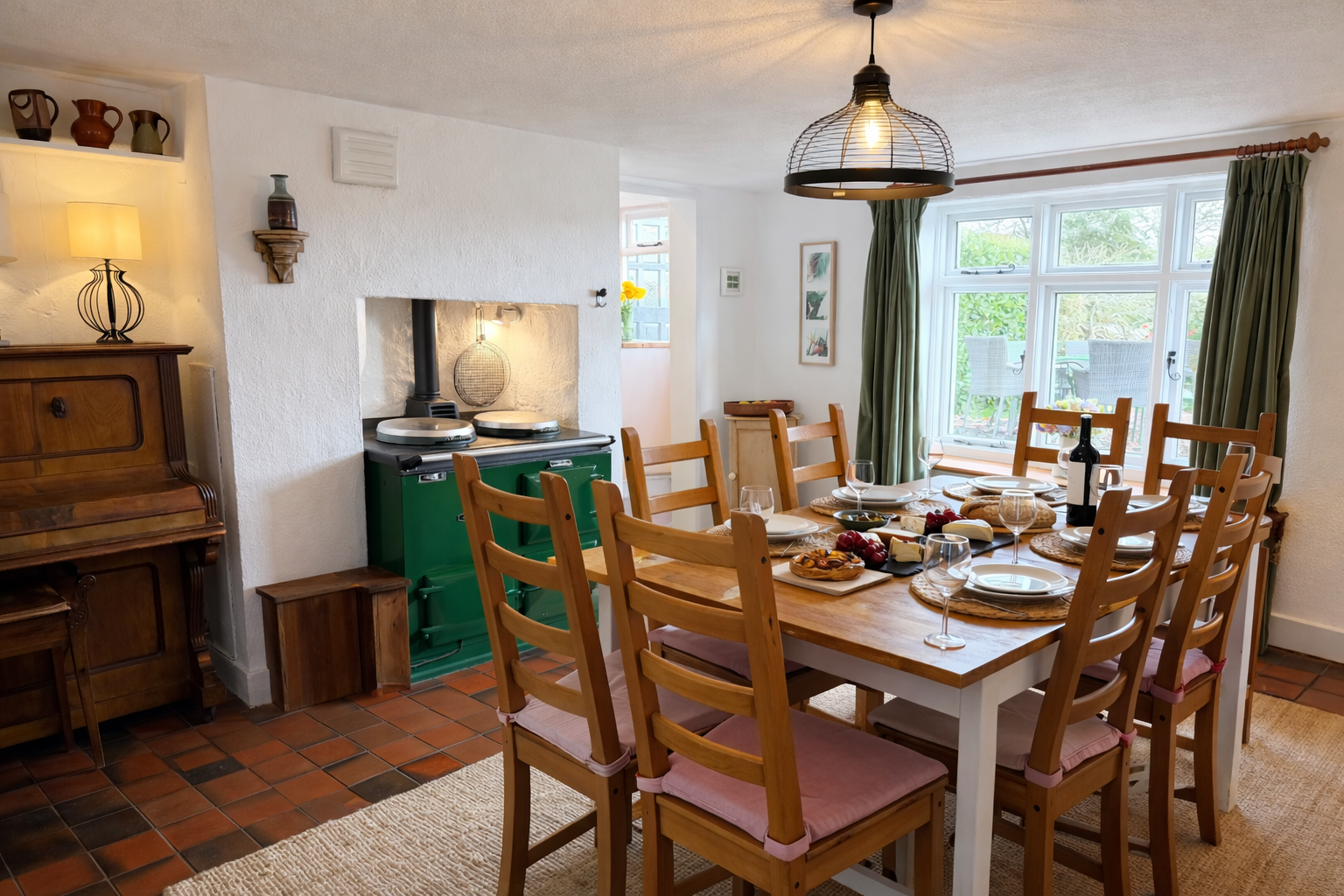 The dining room is connected to the kitchen and located off the main entrance hall. It is tiled and has lovely views of the garden. Alongside the large, extendable table, which comfortably seats eight is an Aga (which is lit October-April) and a piano for added entertainment!